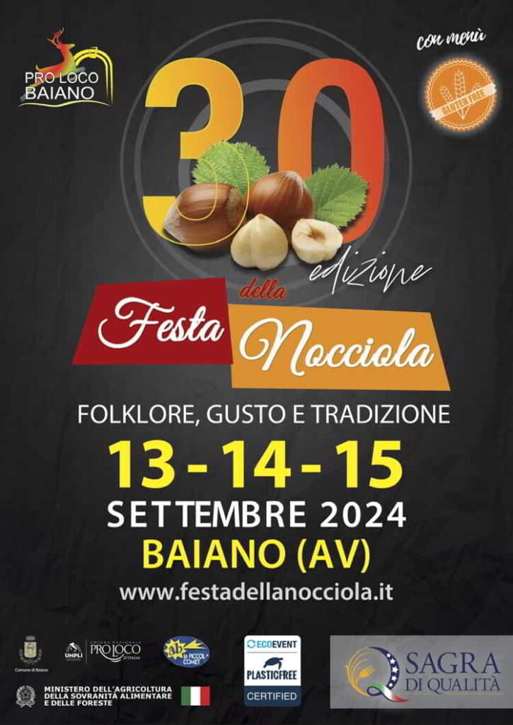 Il 13-14 e 15 Settembre 2024, a Baiano provincia di Avellino, la Pro Loco organizza la 30 esima edizione della Sagra della Nocciola Folklore, Gusto e Tradizione.