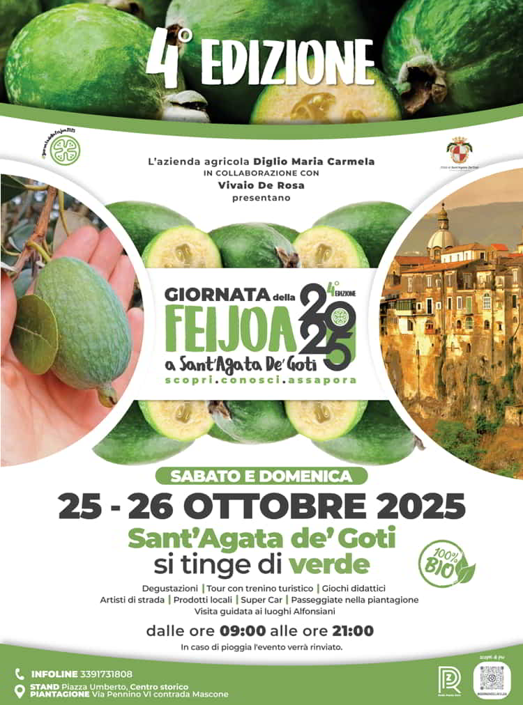 Il 25 e 26 Ottobre 2025 dalle ore 9 alle 21, Sant’Agata de’ Goti, in provincia di Benevento, si tinge di verde, infatti andrà di scena la 4 edizione della Giornata della Feijoa