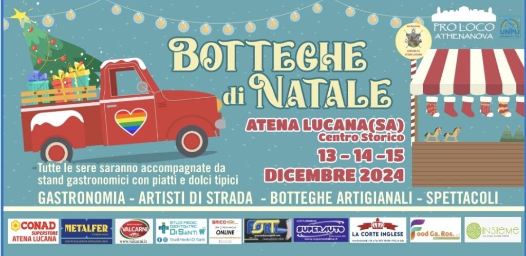 La Pro Loco organizza Botteghe di Natale, nei giorni 13-14 e 15 dicembre 2024, nel centro storico di Atena Lucana in provincia di Salerno. Tutte le sere saranno accompagnate da stand Gastronomici con piatti e dolci tipici.