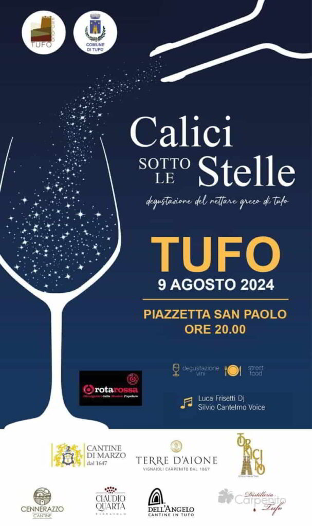 La Pro Loco e il Comune di Tufo presentano Calici sotto le Stelle Degustazione del nettare Greco di Tufo, il 9 Agosto 2024, Piazzetta San Paolo. Oltre la degustazione di vini, street food e musica live.