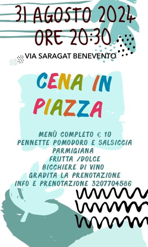 Il 31 Agosto alle ore 20:30 a Benevento, in via Saragat, andrà di scena l’evento Cena in Piazza. Il costo del menù è 10 euro (gradita la prenotazione) e prevede: