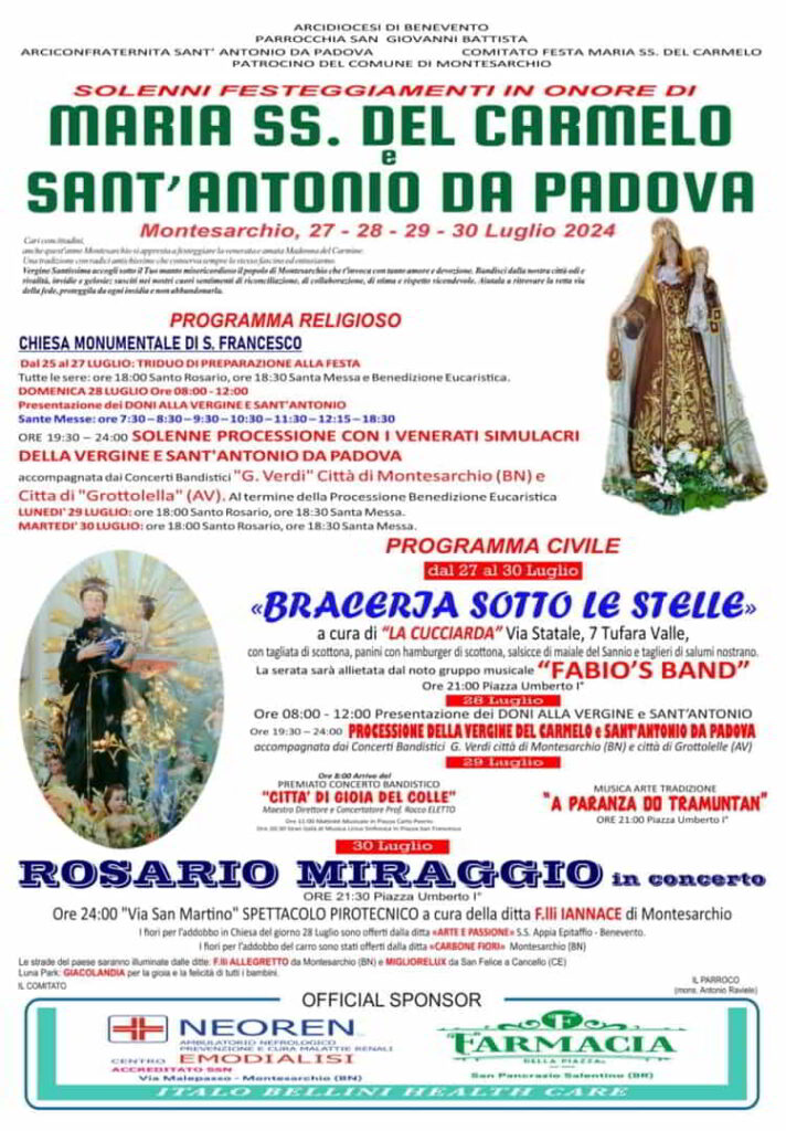 Il Comitato Festa Maria SS. del Carmelo e Sant’Antonio Da Padova, organizza dal 27 al 30 Luglio 2024 (programma civile) a Montesarchio in provincia di Benevento, Braceria Sotto Le Stelle, in Piazza Umberto I. La serata del 30 Luglio sarà accompagnata dal concerto di Rosario Miraggio.