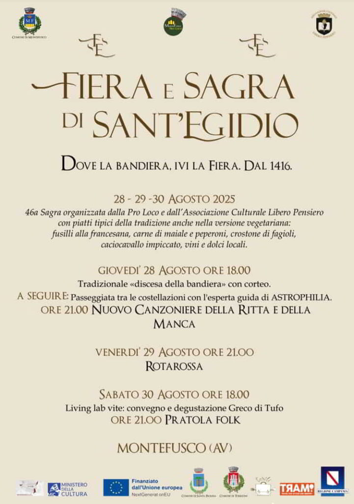 La Pro Loco presenta la con il patrocinio del comune organizza la Fiera e Sagra di Sant’Egidio, dove la bandiera ivi la fiera, a Montefusco in provincia di Avellino, dal 28 al 30 Agosto 2025.
