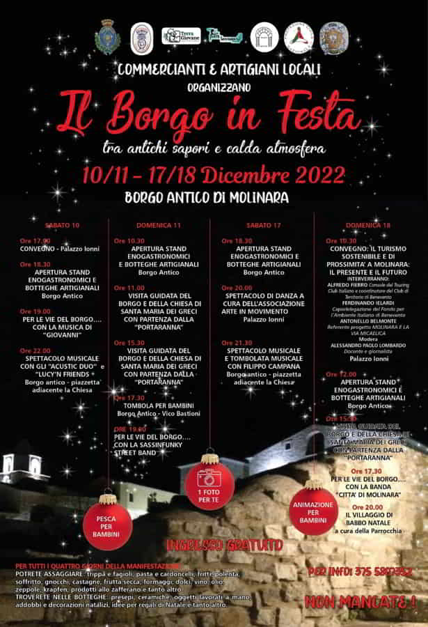 Commercianti e Artigiani locali presentano l’evento Il Borgo in Festa tra antichi sapori e Calda Atmosfera, a Molinara. L’evento si terrà nei giorni 10-11 e 17-18 Dicembre 2022 nel Borgo Antico. Per informazioni 3755807352.