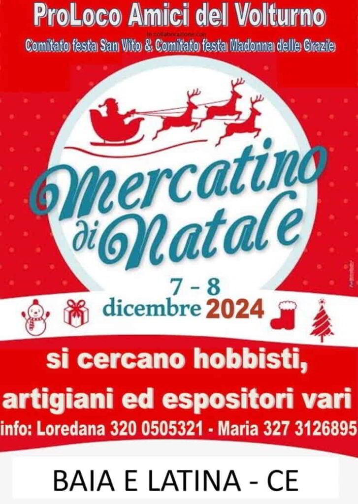 Il Comitato Festeggiamenti San Vito M. e la Pro Loco Amici del Volturno di Baia e Latina presentano Il Mercatino di Natale al Borgo. Sabato 7 Dicembre dalle 16 alle 23 e Domenica 8 Dicembre dalle 15 alle 22.