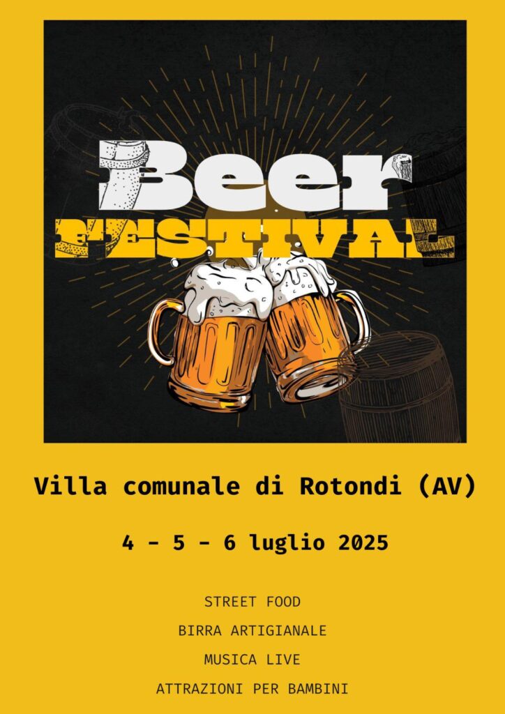 A Rotondi in provincia di Avellino, torna il 4,5 e 6 Luglio 2025, la IV edizione del Beer Festival. L’evento si terrà nella villa comunale. Tre serate piene di: Birra a fiumi, Stand gastronomici con delizie per tutti i gusti, Musica itinerante, DJ set e tanti artisti live.