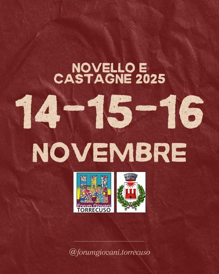 Ritorna a Torrecuso in provincia di Benevento, il tradizionale appuntamento con Novello e Castagne a cura del Forum dei giovani di Torrecuso. La nona edizione della manifestazione andrà di scena il 14-15 e 16 Novembre 2025.