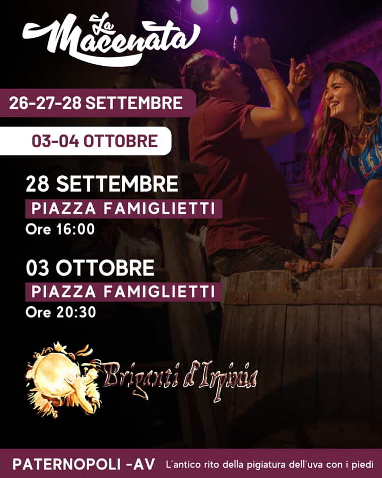Il 26-27-28 Settembre e il 3 e 4 Ottobre 2025, andrà di scena La Macenata, a Paternopoli in provincia di Avellino. 28 Settembre ore 16:00 e 03 Ottobre ore 20:30 in Piazza Famiglietti