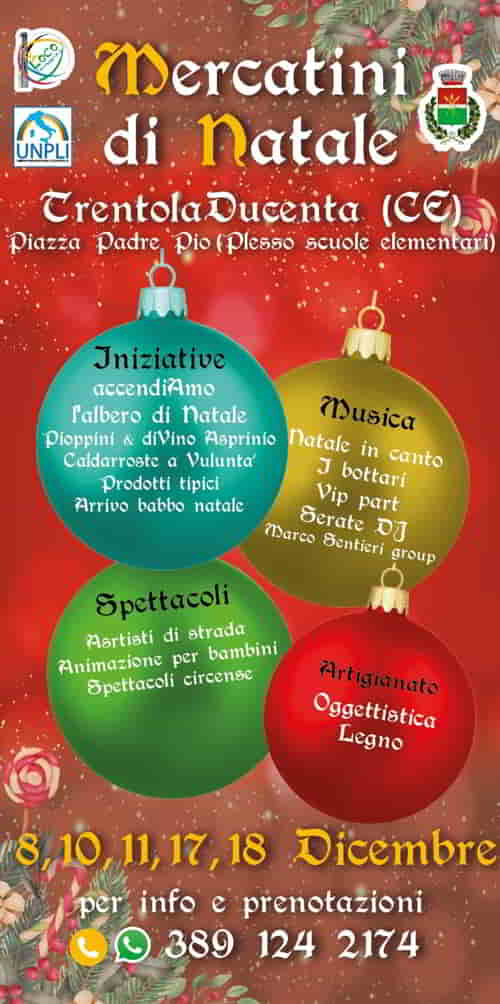 La Pro loco Terrasprinia di Trentola Ducenta presenta i Mercatini di Natale nei giorni 8-10-11-17 e 18 Dicembre 2022. Tante iniziative, tra cui accendiAMO l’albero di natale, enogastronomia , prodotti tipici, musica, spettacoli e artigianato. Per info e prenotazioni 3891242174.