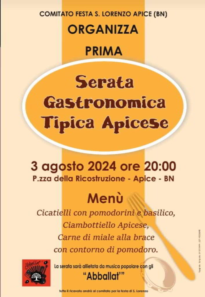 Il Comitato Festa della Contrada San Lorenzo organizza la 1º serata gastronomica tipica Apicese il 3 agosto 2024 alle ore 20:00 presso Piazza della Ricostruzione.