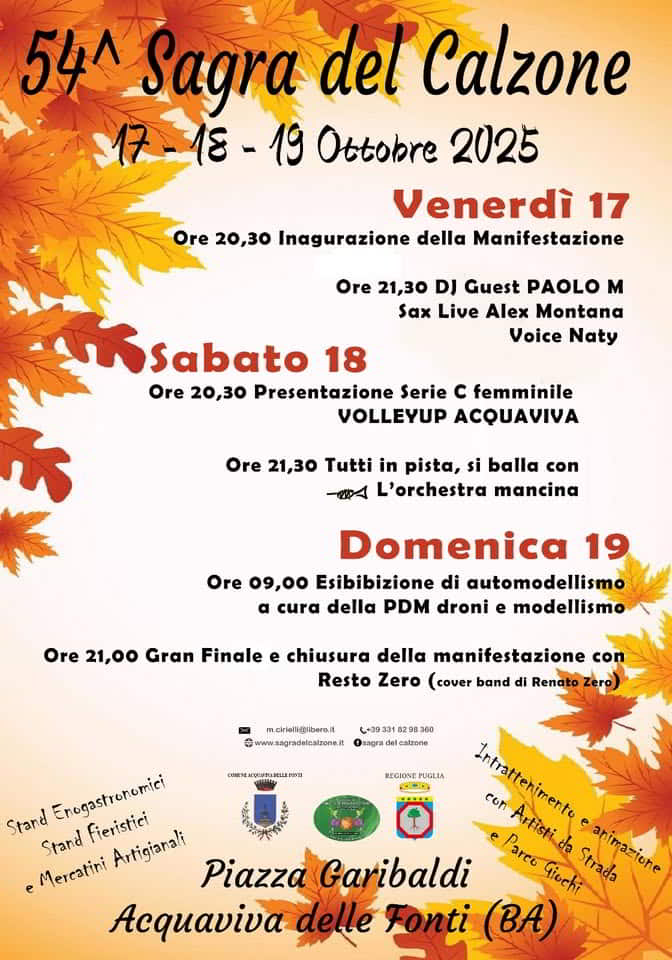 Sagre 54° – Sagra del Calzone – Acquaviva delle Fonti – 2025 Ad Acquaviva delle Fonti in provincia di Bari andrà di scena la 54 esima edizione della Sagra nel Calzone, il 17-18 e 19 Ottobre 2025. LEGGI TUTTO