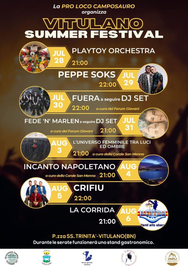 La Pro Loco di Camposauro presenta l’evento Vitulano Summer Fest dal 28 al 31 Luglio 2023 e dal 3 al 6 Agosto 2023 in Piazza SS. Trinità. Il programma:
