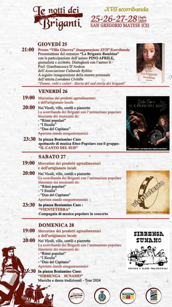 Ritorna dal 25 al 28 Luglio 2024, la XVII edizione dell’evento Le Notti dei Briganti, a San Gregorio Matese in provincia di Caserta. Un evento unico che rievoca il periodo del brigantaggio tra il 1800 e il 1900, offrendo una finestra su un passato affascinante e poco conosciuto. Questo appuntamento itinerante si snoderà attraverso l’incantevole paese, trasformandolo in un palcoscenico vivente di storia e folklore.