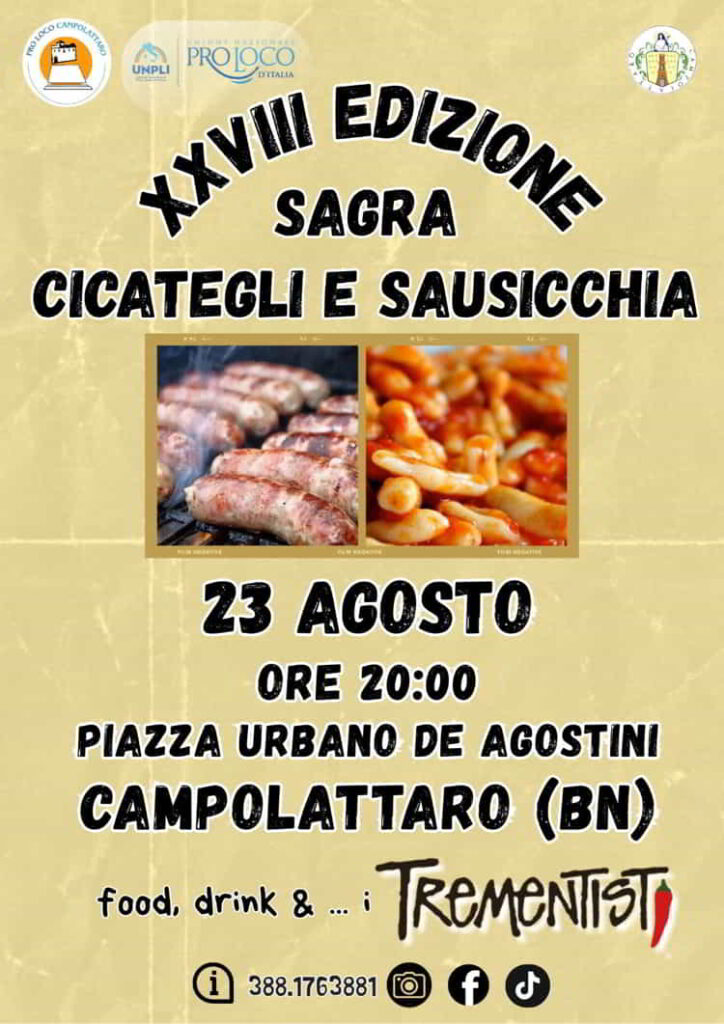 La Pro Loco presenta la XXVIII edizione della Sagra Cicategli e Sausicchia, a Campolattaro in provincia di Benevento. La Sagra si terrà il 23 Agosto 2025 in Piazza Urbano De Agostini a partire dalle ore 20:00. Ad accompagnare la serata musica live con i Trementisti.