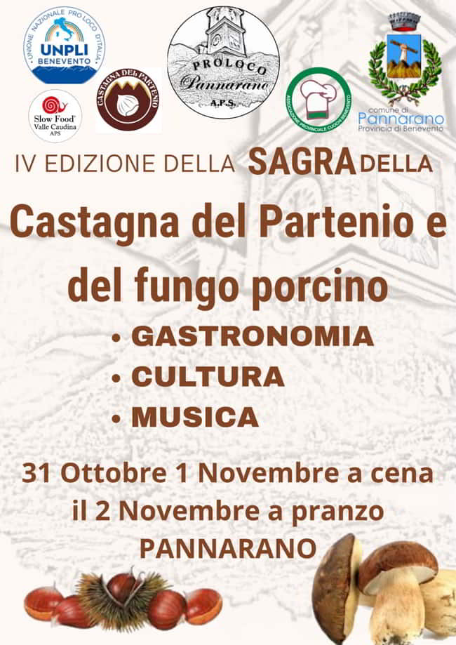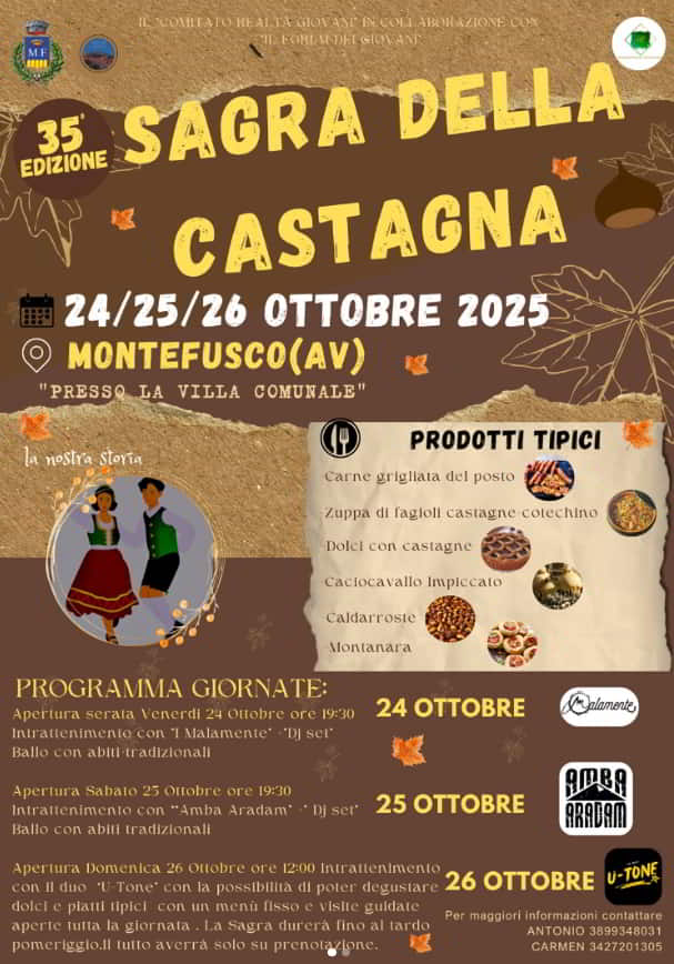 La Comitato Realtà Giovani insieme il Forum dei Giovani presenta la XXXV edizione della Sagra della Castagna. La sagra si terrà il 24, 25 e 26 Ottobre 2025 presso la villa comunale di Montefusco, in provincia di Avellino.