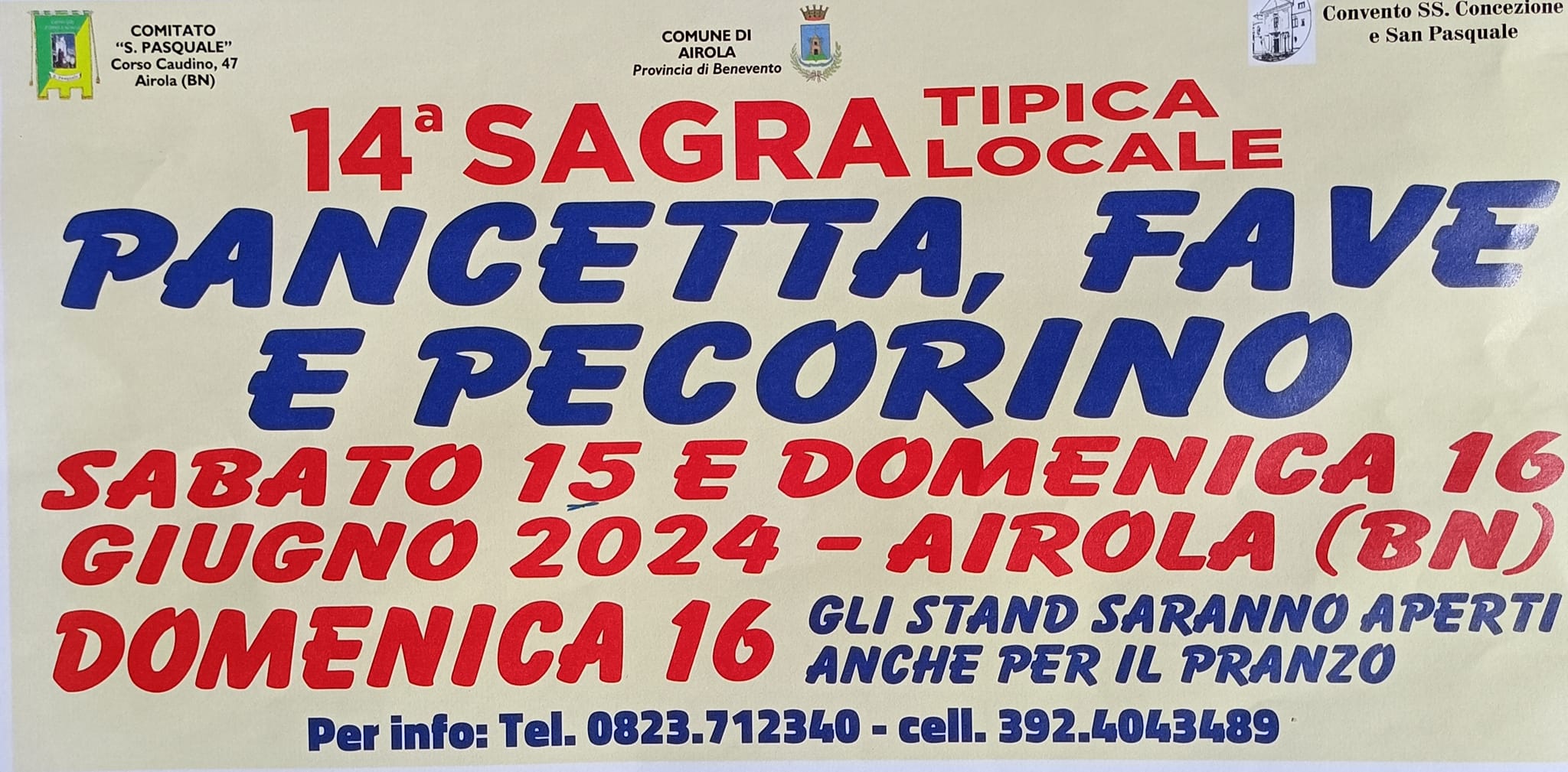L’Associazione San Pasquale presenta la 14 esima edizione della Sagra Pancetta Fave e Pecorino, il 15 e 16 Giugno 2024 ad Airola, provincia di Benevento.
