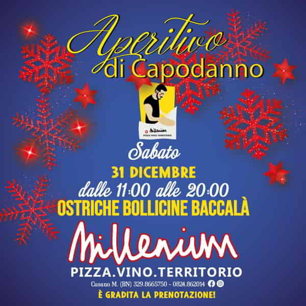 Il Millenium a Cusano Mutri presenta l’evento l’aperitivo della Vigilia del 31 Dicembre 2022 dalle 11 all 22. Ostriche, Bollicine e BaccalΓ !