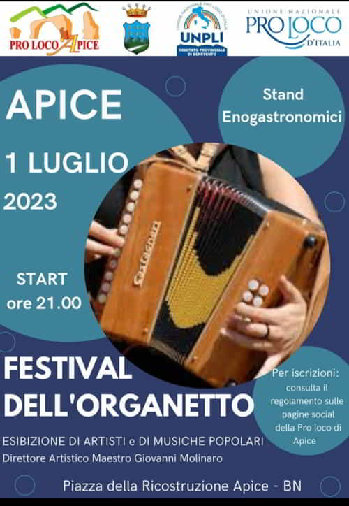 È indetto il primo festival dell’organetto della Pro loco di Apice che si terrà il 1 Luglio 2023. Possono partecipare musicisti di tutte le età