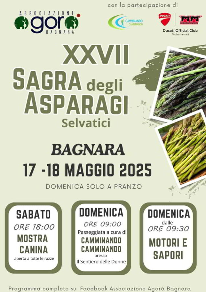 L’Associazione Agorà organizza la XXVII edizione della Sagra degli Asparagi Selvatici, a Bagnara in provincia di Benevento, il 17 e 18 Maggio 2025. In occasione dalla sagra il 18 Maggio andrà di scena Motori e Sapori.