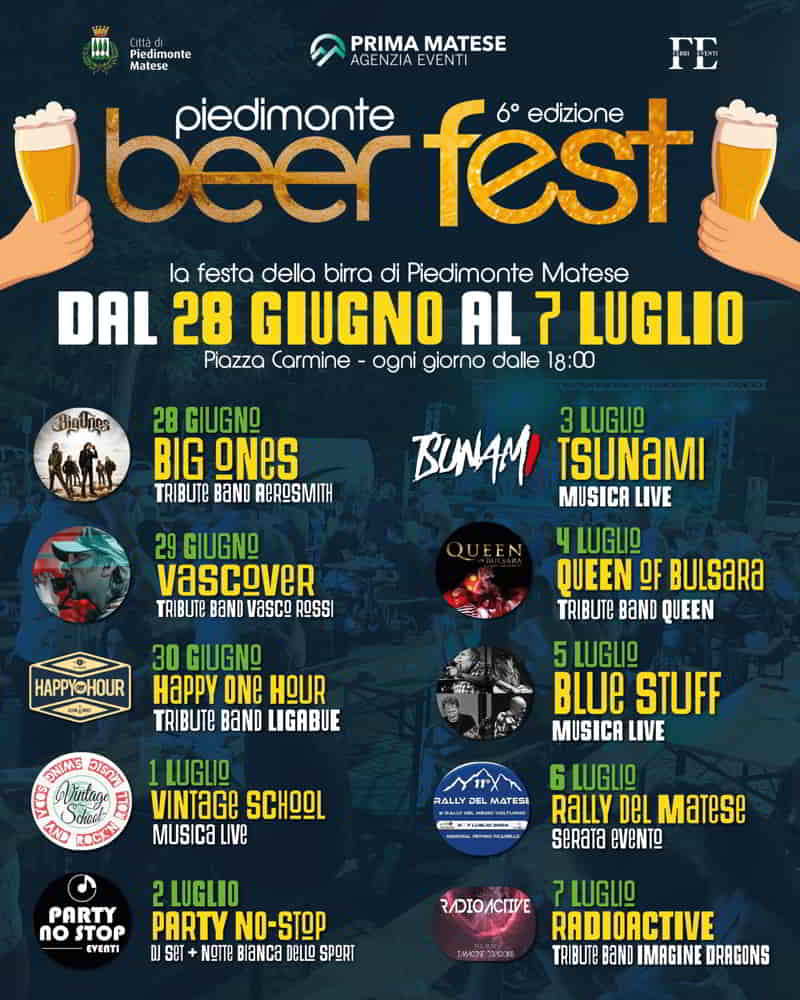 Dal 28 Giugno al 7 Luglio 2024, torna la 6ta Edizione del Beer Fest a Piedimonte Matese in provincia di Caserta. Ingresso gratuito e stand