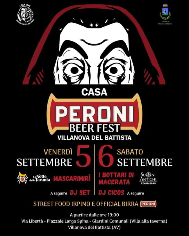 Il 5 e 6 Settembre 2025, dalle ore 19:00 a Villanova del Battista, in provincia di Avellino, avrร luogo l’evento Casa Peroni Beerfest. 5 Settembre