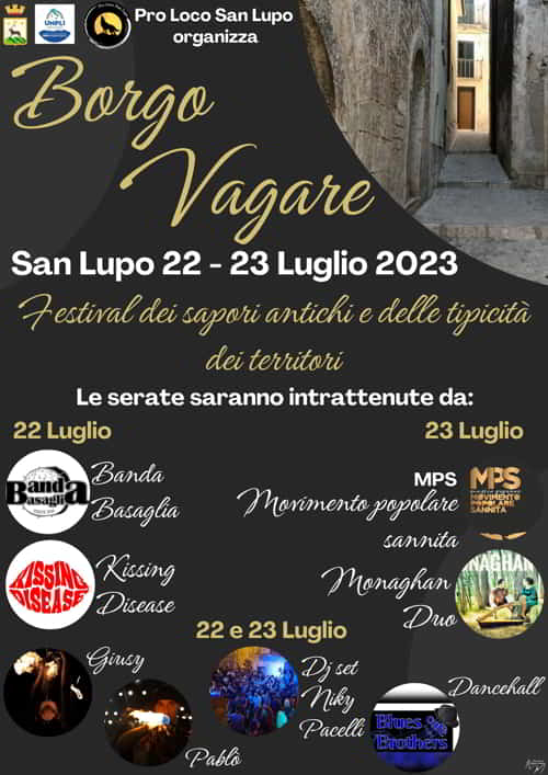 La Pro Loco di San Lupo organizza la nuova edizione di Borgo Vagare, il 22 e 23 Luglio 2023. Le serate saranno intrattenute da: 22
