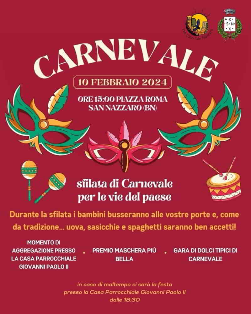 La Pro Loco di San Nazzaro, presenta il Carnevale. Alle 15.00 a Piazza Roma a San Nazzaro provincia di Benevento.