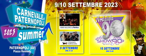 Carnevale di Paternopoli Summer Party 2023 presenta il 9 Settembre 2023 Mimmo Maglionico e PietrArsa a Seguire compagnia Daltrocanto e il 10 Settembre 2023, special
