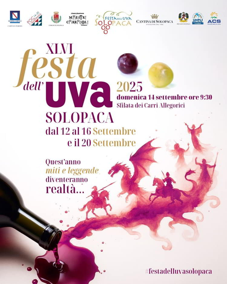 XLVI edizione della Festa dell’Uva a Solopaca in provincia di Benevento, andrร di scena dal 12 al 16 Settembre 2025 e il 20 Settembre 2025.