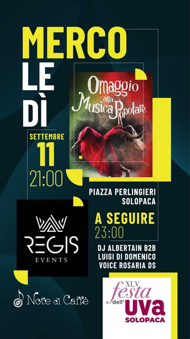 XLV edizione della Festa dell’Uva continua anche l’11 Settembre a Solopaca in provincia di Benevento, con Omaggio alla Musica Popolare alle ore 21.00 in piazza