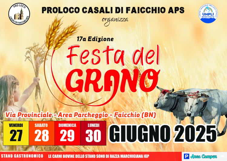Il 23-24 e 25 (anche a pranzo) Giugno 2023, ai Casali di Faicchio, in provincia di Benevento, torna la XV Edizione della Festa del Grano.