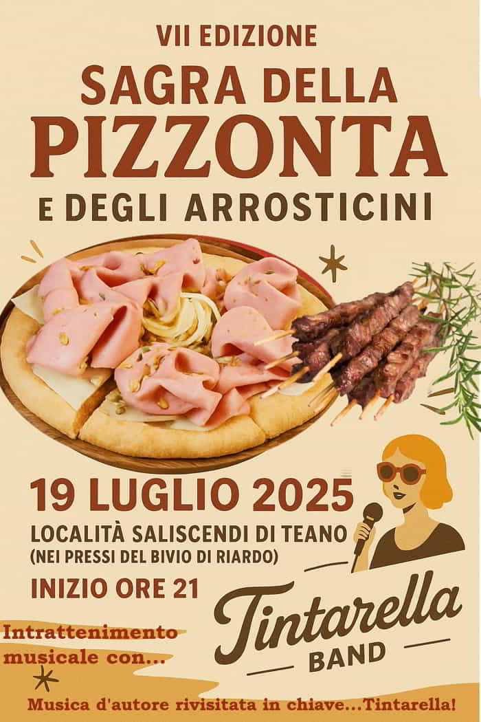 Il 19 Luglio 2025, VII edizione della Sagra della Pizzona e degli ArrosticiniΒ in localitΓ Saliscendi di Teano in provincia di Caserta.