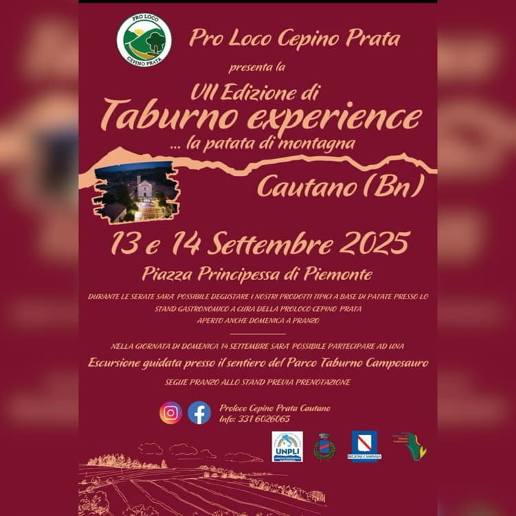 Grazie all’impegno della Proloco Cepino-Prata Cautano APS, anche quest’anno avrร luogo la VII Edizione di Taburno Experience… la patata di montagna. Il 13 e 14
