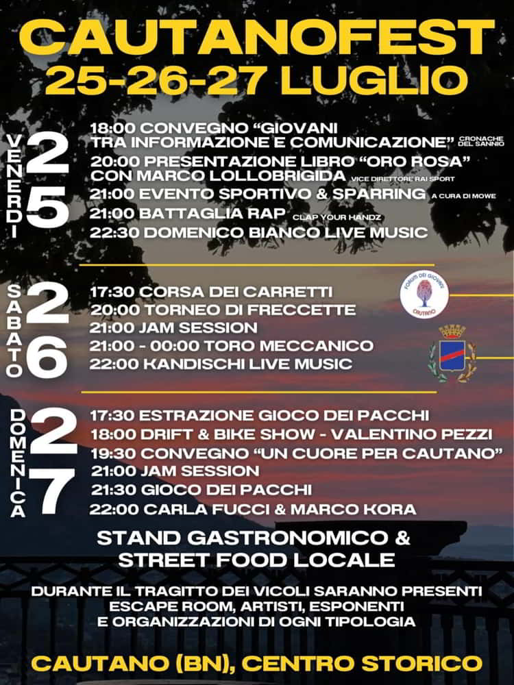 Il Forum dei Giovani di Cautano organizza Cautano Fest dal 25 al 27 Luglio 2025, a Cautano in provincia di Benevento. Tre giorni di musica,
