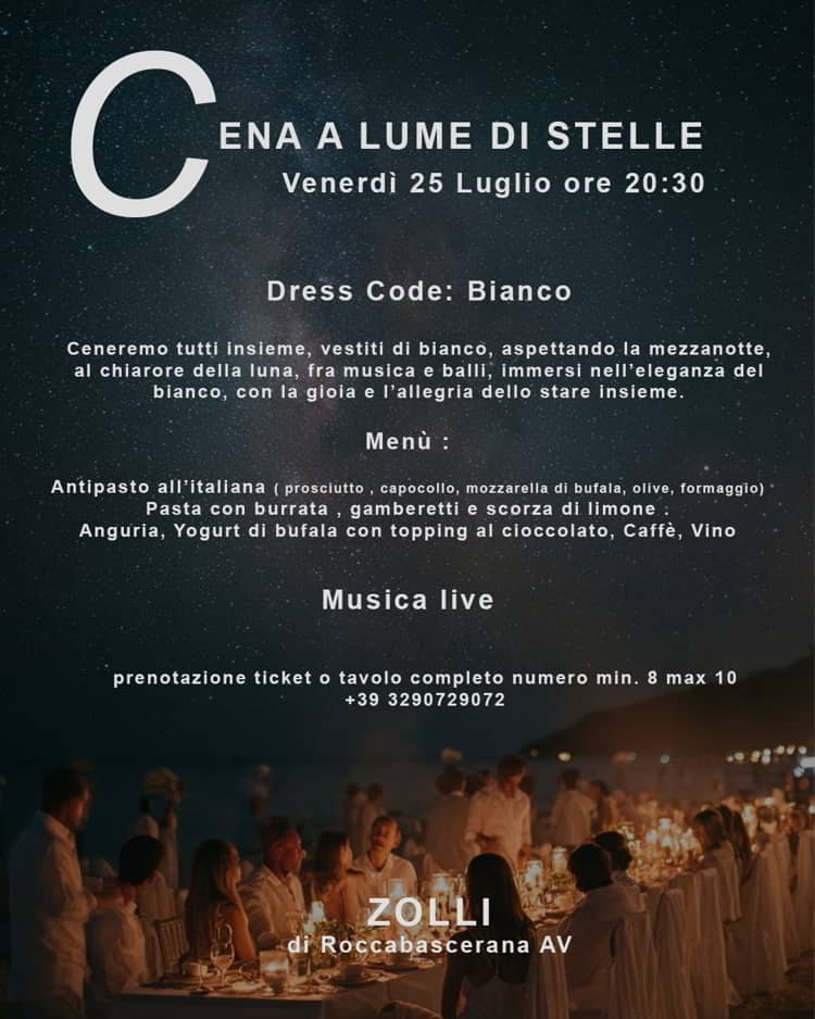Il 25 Agosto, a Zolli di Roccabascerana, l’evento Cena a Lume di Stelle, a partire dalle ore 20.30, Dress Code Bianco, Musica dal vivo, per
