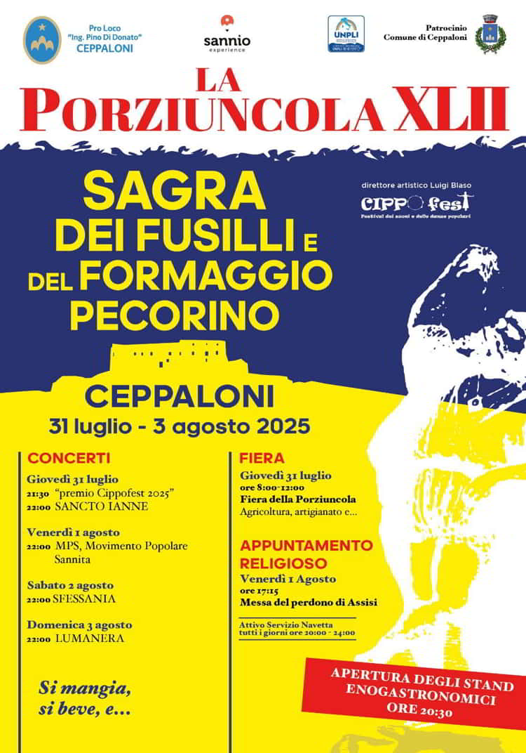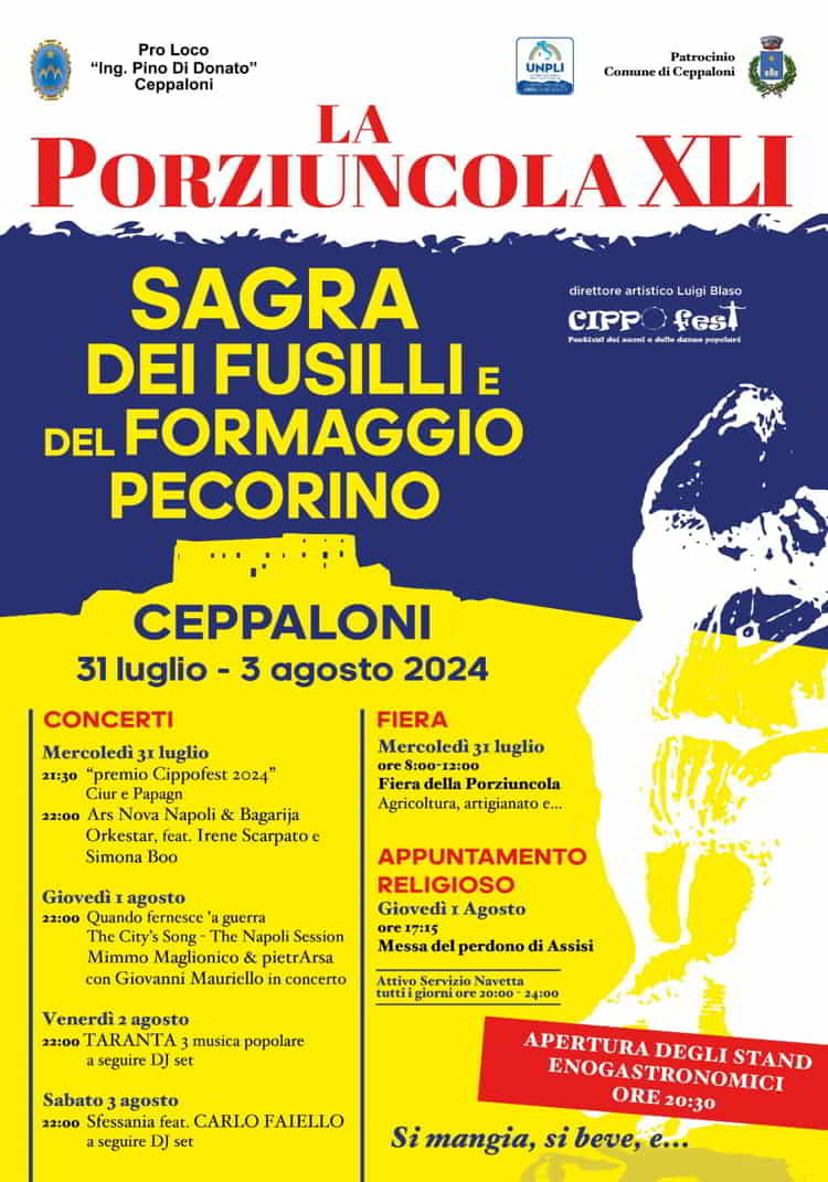 La Pro Loco “Ing. Pino Di Donato” con il patrocinio del Comune di Ceppaloni presenta la Porziuncola XLII – Sagra dei Fusilli e del Formaggio
