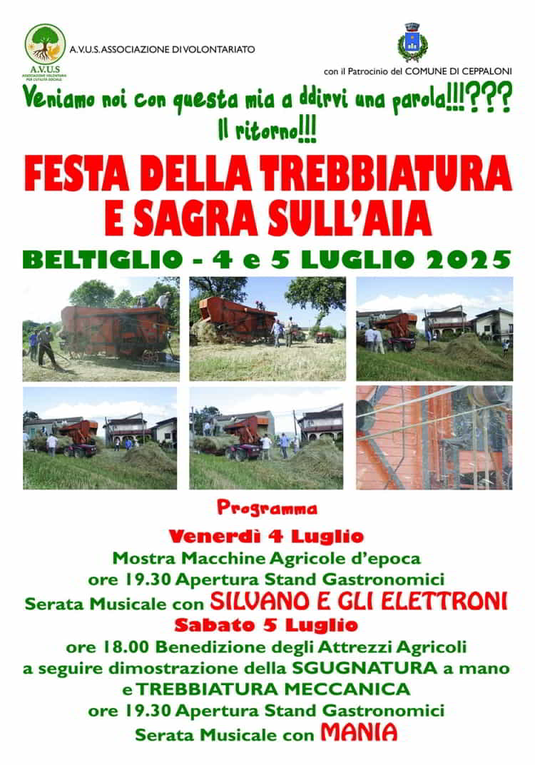L’Associazione Avus organizza la Festa della Trebbiatura e Sagra sull’Aia, il 4 e 5 Luglio 2025 a Beltiglio di Ceppaloni in provincia di Benevento (presso