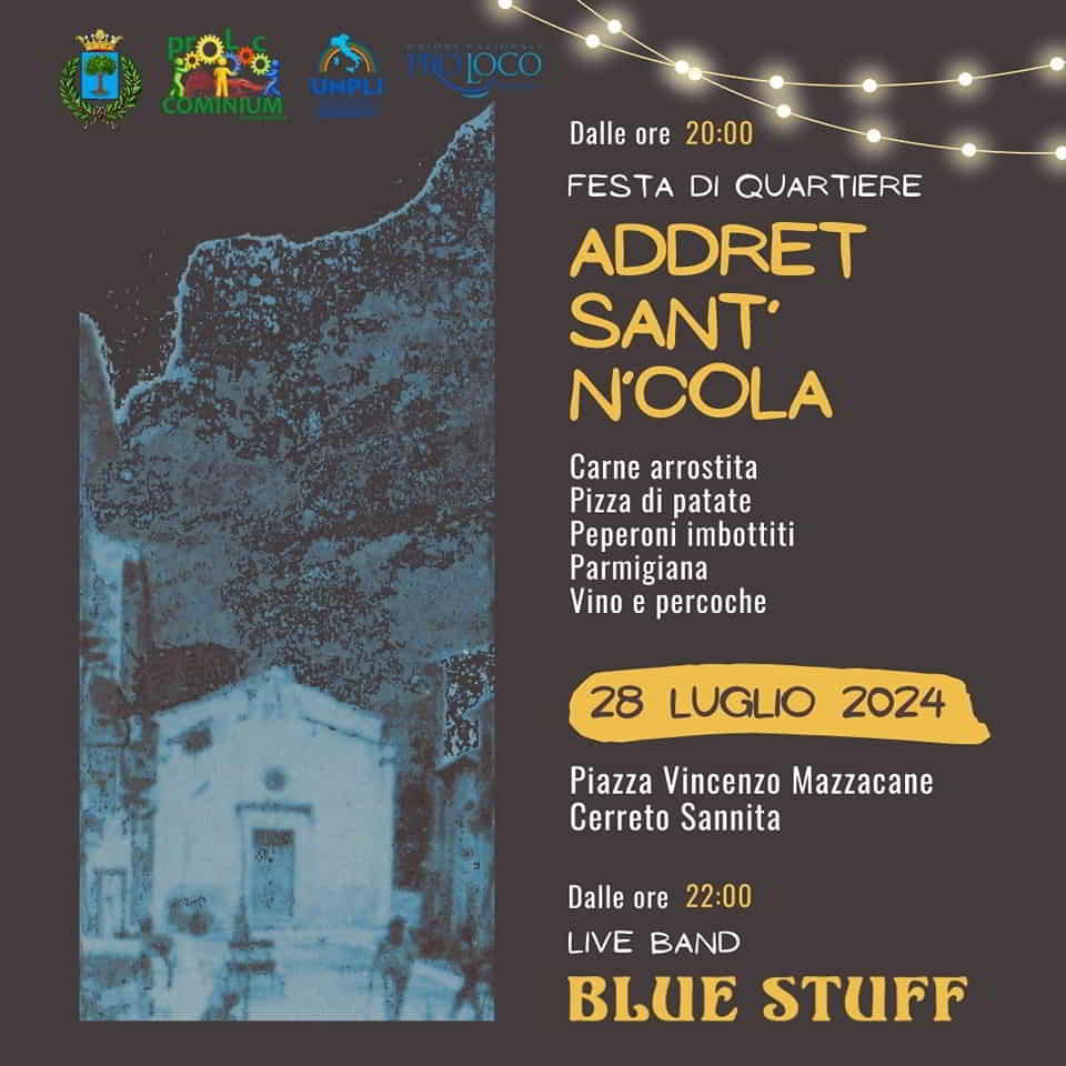 La Pro Loco Cominium presenta Addret Sant’ N’cola – Festa di quartiere. Domenica 28 Luglio 2024 inizio ore 20.00.