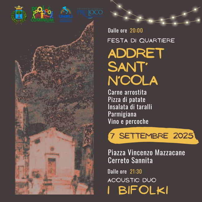 La Pro Loco Cominium presenta Addret Sant’ N’cola – Festa di quartiere. Domenica 7 Settembre 2025 inizio ore 20.00 a Cerreto Sannita in provincia di
