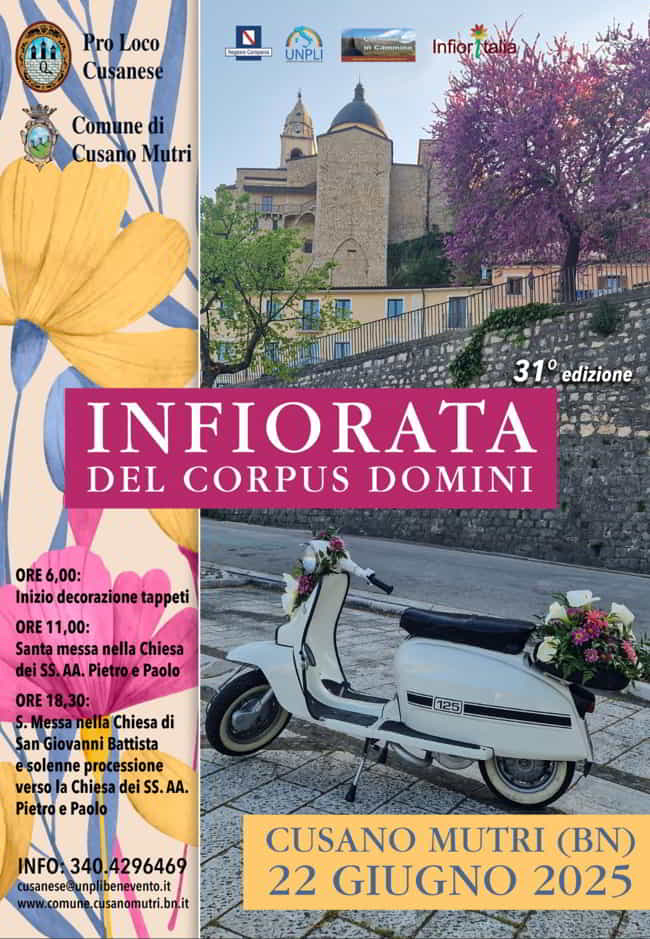 La Pro Loco e il Comune organizzano l’Infiorata del Corpus Domini, il 22 Giugno a Cusano Mutri, in provincia di Benevento.