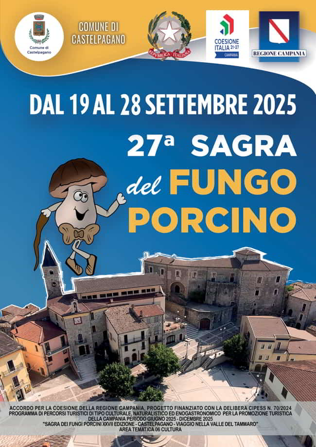 Il Comune di Castelpagano in provincia di Benevento, presenta la 27 esima edizione della Sagra del Fungo Porcino dal 19 al 28 Settembre 2025. La