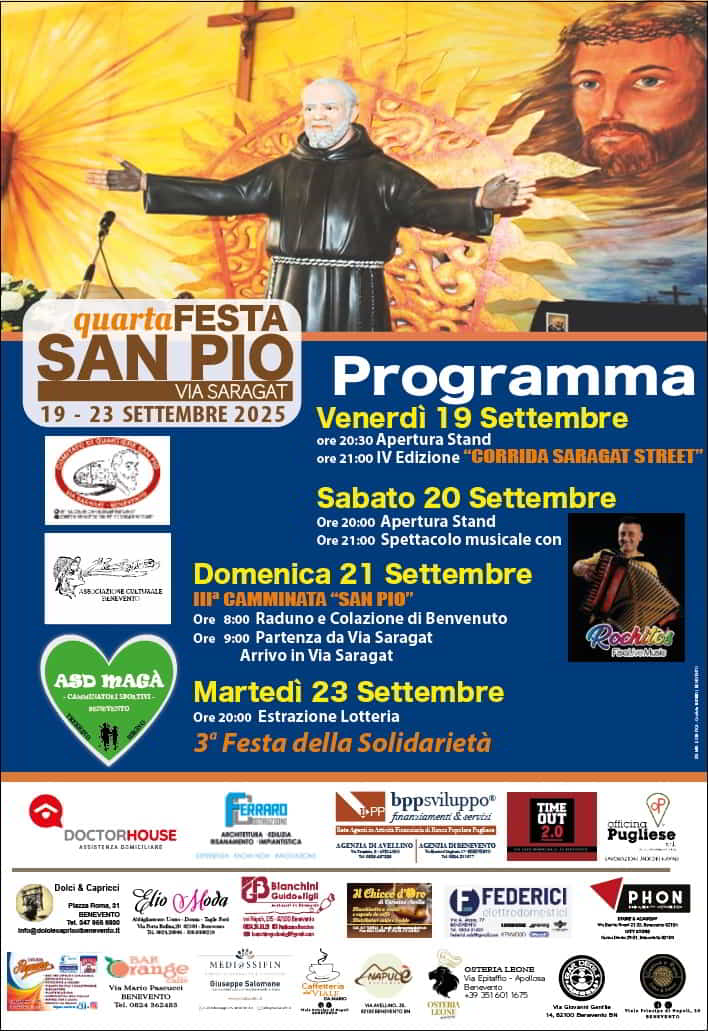 Il Comitato di quartiere San Pio di Via Saragat organizza la Terza Festa di San Pio, a Benevento in Via Saragat, dal 19 al 23
