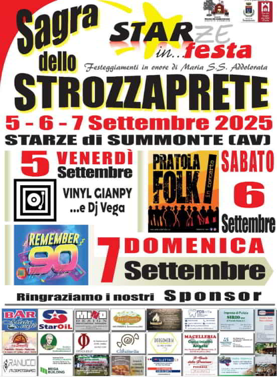 Il 5-6 e 7 Settembre 2027, a Summonte in provincia di Avellino, Sagra dello Strozzaprete, in virtΓΉ dei festeggiamenti in onore di Maria SS. Addolorata.
