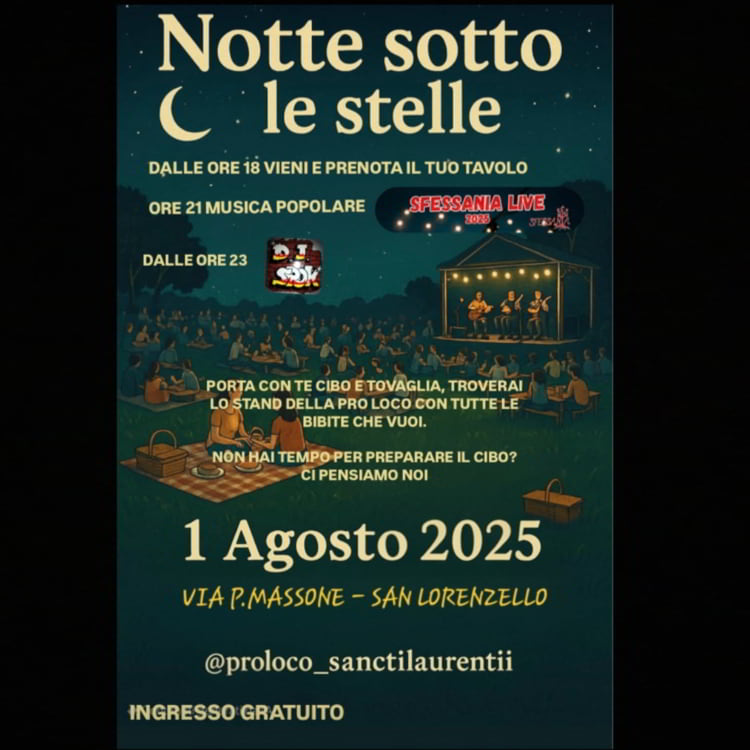Il 1 agosto, a San Lorenzello in provincia di Benevento, Notte Sotto le Stelle, organizzata dalla Pro Loco.