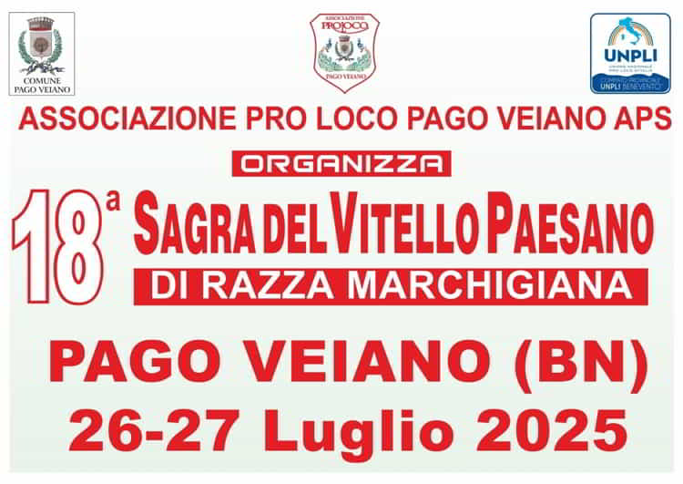 La Pro Loco di Pago Veiano presenta la diciottesiama edizione della Sagra del Vitello Paesano di razza Marchigiana. La manifestazione si terrΓ il 26 e