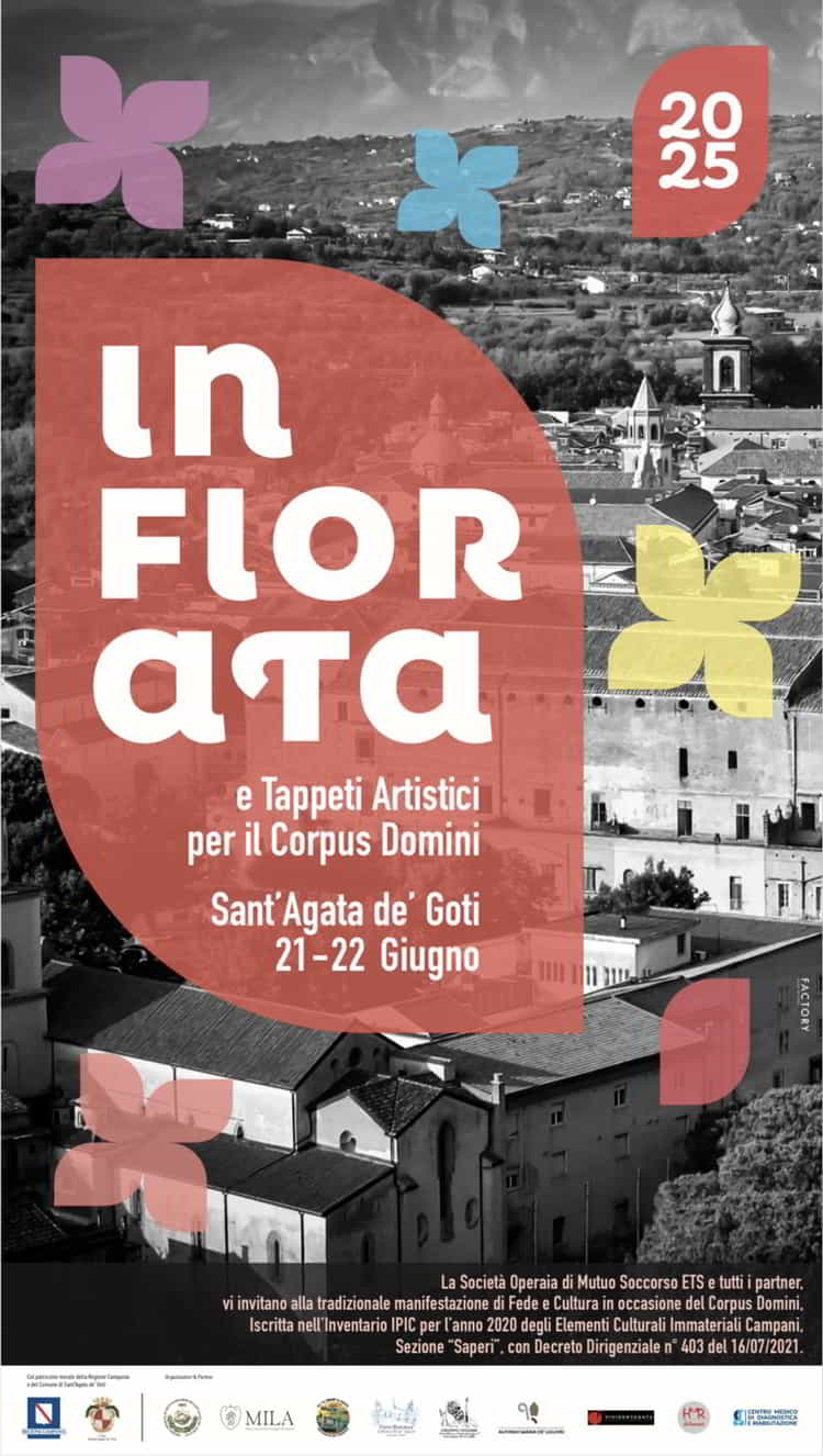 La SocietΓ Operaia di Mutuo Soccorso organizza l’Infiorata, il 21 e 22 Giugno 2025 a Sant’Agata de’ Goti in provincia di Benevento.