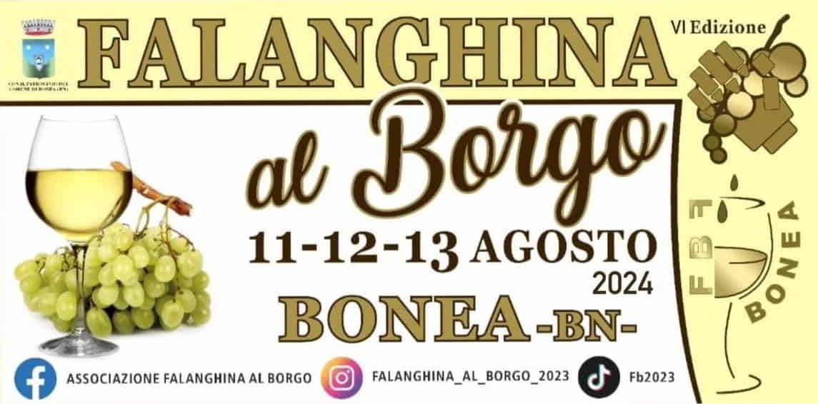 Nei giorni 11-12 e 13 Agosto 2025, a Bonea in provincia di Benevento torna l’evento Falanghina al Borgo, a cura dell’Associazione Falanghina al Borgo.
