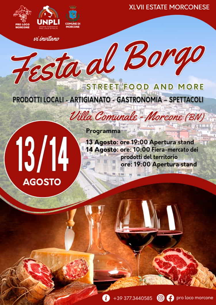 La Pro Loco organizza Festa al Borgo, il 13 e 14 Agosto 2025 a Morcone in provincia di Benevento.Presso Parco Tommaso Lombardi – Villa Comunale