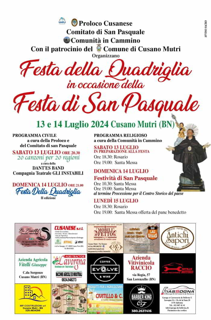 La Pro Loco Cusanese, il comitato San Pasquale con il patrocinio con il comune di Cusano Mutri organizzano la Festa della Quadriglia, in occasione della