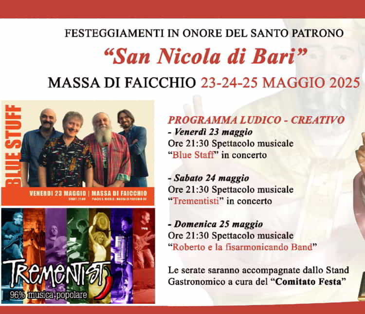 A Massa di Faicchio, in provincia di Benevento, il 23-24 e 25 Maggio 2025, il comitato festa e il comune organizzano i festeggiamenti in onore